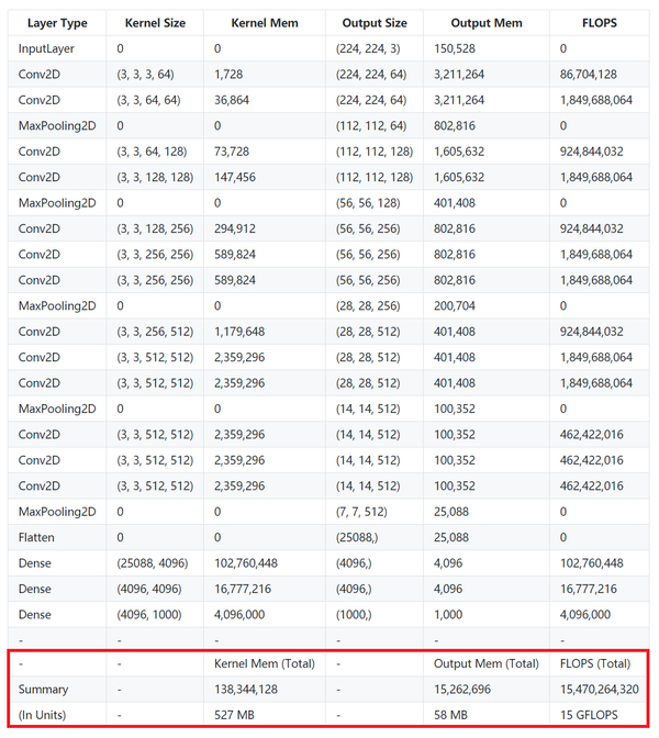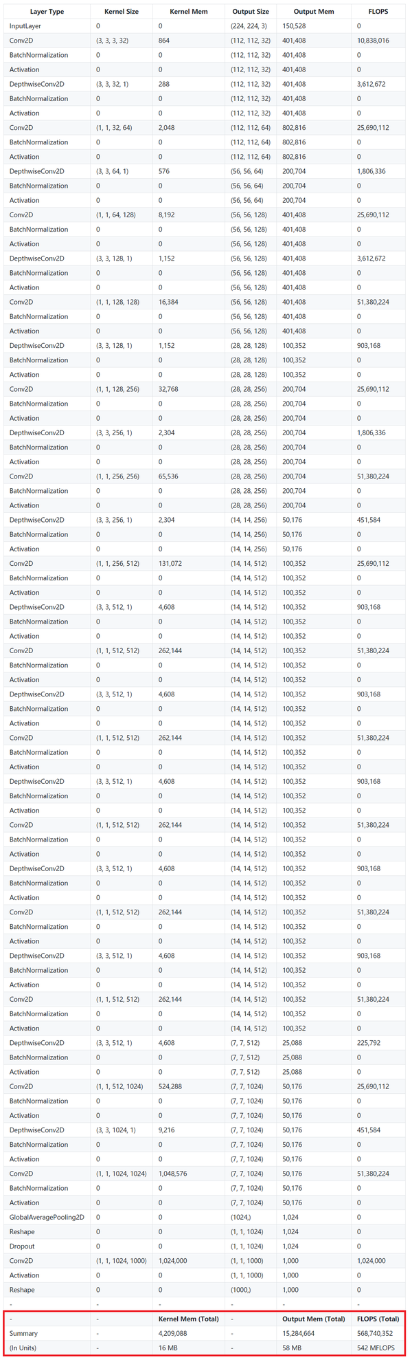 下面让我们先分别给出 VGG16 和 MobileNet 的计算量和访存量统计表格,然后再用 Roof-line Model 理论来对比分析一下下。很有意思哦!