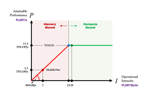 - MobileNet 处于 Memory-Bound 区域。在 1080Ti 上的理论性能只有 3.3 TFLOP/s。